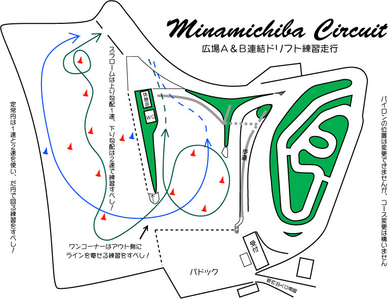 (コース設定は適宜変更、ドリフト・ジムカーナいずれの練習でも思い切り走ってください)